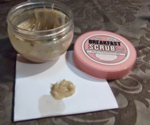 เนื้อสครับจะหยาบกว่า Breakfast Scrub ค่ะ แต่สีคล้ายๆกัน ส่วนกลิ่น ยังคงหอมเหมือนเดิมค่ะ แต่เวลาอาบแล้ว ต้องทำใจนิดนึงนะคะ ว่ากลิ่นจะดรอปลงเยอะเลย