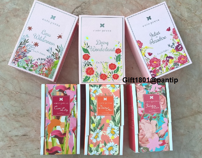 ตัวบรรจุภัณฑ์เรียกได้ว่า ทำออกมาสวยกว่าราคา ลายดอกไม้สีสันสดใสและดูคลาสสิคเลยทีเดียว เปิดกล่องโดยใช้วิธีดันฝากระดาษขึ้นมา จะเจอขวดน้ำหอม อยู่ในบล็อกพลาสติก สินค้าดูเรียบร้อย ง่ายต่อการขนส่งค่ะ ตัวขวด ใช้เป็นการสกรีนด้านหลัง พอมองที่ขวดน้ำหอม ก็จะเห็นรูปที่สื่อความหมายของแต่ละกลิ่นออกมาค่ะ