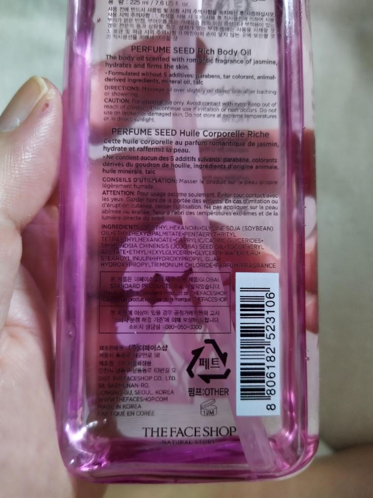 เขาเขียนใส่ขวดมาเลยนะคะ ว่าไม่มีส่วนผสม 5 ประการ อย่าง Paraben, tar colorant, animal-derived ingredient, mineral oil, Talc ซึ่งเราอนุมานไปล่วงหน้าแล้วว่า เราไม่น่าแพ้น๊าาาาา